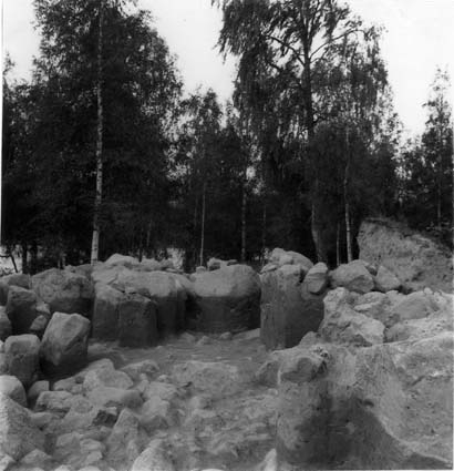 Bildnummer: Fo-A3182 Mapp: 368 Ur Länsmuseet Västernorrlands bildarkiv Motivord: Arkeologi, Arkeologisk undersökning, Gravanläggning, Gravfält, Gravhög Fotograf: Carl Cullberg Plats: Holm Överlännäs Sollefteå Ångermanland Fotot är daterat till 1955Gravfältet vid Holm, hög nr 3. Röset, sektion 4, från sektion 1.