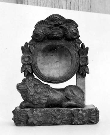 Urställ Inv.nr. M 1462 Klockställ av Zakris Persson. Rund utskärning för uret med ett hål upptill för att kunna stoppa ned uret. Hålet täcks på framsidan av det skulpterade krönet med två rosor. På sidorna två blommor med blad. Detta runda ställ upptärs av två fyrsidiga stolpar, som är placerade på en rektangulär sockel. Sockelns sidor har snidade blommor och blad, dock inte på baksidan. På sockeln, mellan stolparna ligger ett lejon. Sockelns ovansida, stolparna och urhålkningen för uret är vitmålade. I övrigt är stället grön och gulmålat. På baksidan står skrivet " hagberg ", samt " nils " och något oläsligt. Under sockeln står troligen " 1851 " inristat, samt något oläsligt.