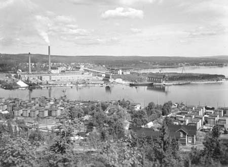 Bildnummer: Fo-BFF299 Ur Länsmuseet Västernorrlands bildarkiv Motivord: Industriområde, Sågverk Plats: Timrå Medelpad Flygfoto över Östrands sulfatfabrik.