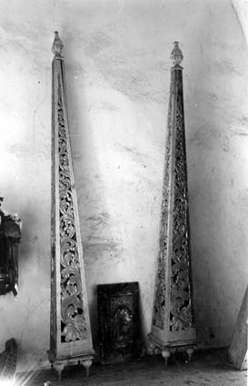Bildnummer: Fo-CG80 Mapp: 266 Ur Länsmuseet Västernorrlands bildarkiv Motivord: Kyrka, Kyrkoinventarie Fotograf: Arvid Holmstedt Plats: Stigsjö Härnösand Ångermanland Fotot är daterat till 1912Pyramider i kyrkan