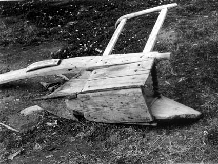 Träplog med plåtbeslagen träfjöl. Åsen 2,2 m med slitkloss på vänstersida. Ståndare 90 cm höga. 37 cm avstånd mellan ståndarna (mitten-mitten). Landsidan hel´, och 22 cm hög till åsen. Fjölen ur en stock som ej holkats ur i sin spets. Plogen lutar åt vänster. Bottenbrädan är tre cm tjock. Mullfot och skära saknas. Åsen är infälld i fjölen.