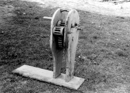Bildnummer: Fo-S589_4_5 Mapp: 632 Ur Länsmuseet Västernorrlands bildarkiv Motivord: Repslagarmaskin Fotograf: Per Söderlind Plats: Västergensjö Anundsjö Örnsköldsvik Ångermanland Repslagarmaskin, inskuret G i S 1838. Hos Andreas Jonsson född 14/8-1870.