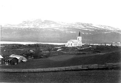 Bildnummer: Fo-U11258 Ur Länsmuseet Västernorrlands bildarkiv Motivord: Bostadshus, Fjäll, Jordbruk, Kyrka, Prästgård Plats: Kall Jämtland Kalls kyrka och Åreskutan.