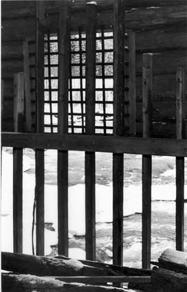 Bildnummer: Fo-U7367 Mapp: 480 Ur Länsmuseet Västernorrlands bildarkiv Motivord: Sjöbod, Vinterbild Fotograf: Lars Cnattingius Plats: Alby Borgsjö Ånge Medelpad Fotot är daterat till 1974-03-15Fiskehuset i järnvägsforsen vid sjön Alderns utlopp i Ljungan.