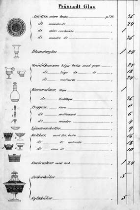 Foto:Nordiska museet. Priskurant för Skönviks glasbruk. Pressglas i priskuranten från 1843.