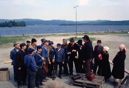 Bildnummer: Fo-YLMLG01335 Ur Länsmuseet Västernorrlands bildarkiv Motivord: Människor, Skådespelare, Teaterföreställning Fotograf: Lars Guvå Plats: Nyland Ytterlännäs Ångermanland Fotot är taget någon gång mellan 1970 och 1990"Hungermarschen" regisserad av Margareta Sundström 1981. Pjäsen spelades i hamnen i Nyland.