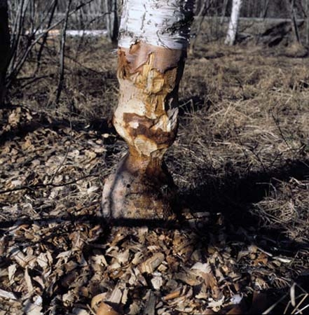Bildnummer: Fo-YLMLG01389 Ur Länsmuseet Västernorrlands bildarkiv Motivord: Björk Fotograf: Lars Guvå Plats: Ångermanland Fotot är taget någon gång mellan 1980 och 1990Björkens stamrot avgnagad av bäver.